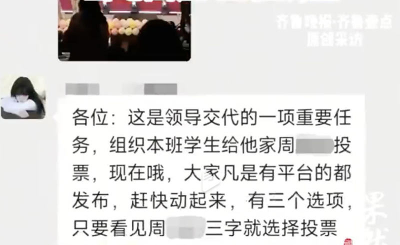 ▲郑州一职业学校校长要求学生为儿子的比赛投票,引发热议。图/齐鲁晚报 近日,郑州一职业学校校长要求学生为儿子的比赛投票,引发热议。据齐鲁晚报报道,近日,一名学生发布了一段视频,班级群里有人发出通知,号召一名在浙江某大学就读的学生投票评选“校园十佳歌手”。他说,“这是领导交办的一项重要任务,我们组织本班学生给他的家人周某投票,谁有平台就发帖。”发帖者还表示,“只要看到周某这个人物,你就选择投票”。随后,该博主又发布了一条内容,要求班主任删除该视频。附文“学校领导强行删除视频”。作为学校领导班子的一员,他利用自己的优势thity组织学生为儿子参加校园歌唱比赛拉票。为校园拉票,看似一件“小事”,但做法并不妥当,也违背了教师职业道德。学校也有必要将他免职并道歉。周的行为不容小觑。一、拉票损害其他参赛者权益 “校园十佳歌手”比赛以学生参赛者的实力和表现来评判。周组织学校学生为儿子拉票,明显损害了比赛的公平性,损害了其他参赛者的权益。事实上,周某某获得第三名,很可能是在父亲的“帮助”下。其次,周某的行为可以说是“恶劣”的,产生了不良影响。周先生是一名教师兼学校校长。这种状态意味着他们必须离开以身作则,引导学生和员工遵循公平、公正、诚信的原则,为教职员工和学生树立榜样。但周利用职务之便,组织学生投票。本质上,这是滥用职权谋取私利的共性。这不仅损害了教师群体的形象,对师生产生负面的榜样作用,尤其不利于正确价值观和行为规范的养成。而且,周要求学生删除视频的行为,进一步凸显了“权力任性”,可谓是错上加错。周要求学生投票给他的儿子。这种权力行为损害了学生的公平竞争意识和规则意识。 “事故”发生后,周要求学生删除视频并“保持沉默”。这种反复的故意行为会给学生带来心理压力和焦虑,甚至涉嫌侵犯学生合法权益。这件事在网络曝光后,引发网友热议。有人称赞此事,并评论说:“有一个好父亲,每个人都可以火上浇油。”这反映出公众对涉及教师公平和道德问题的高度关注。网民对周恩来的批评和谴责,也体现了公众对教育领域诚信、公平、正义的期盼。目前,学校已发布声明称,涉事校长已被免职,并责令向涉事师生道歉。学校的快速反应和处理措施是必要的,在一定程度上可能会出现失误,但关键是要加强管理,从根本上防止类似事件再次发生。撰文/辛禾(媒体人)编辑/迟道华/刘军校对